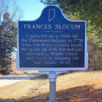 Frances Slocum was captured as a child by the Delaware Indians in 1778 from her Pennsylvania home, she grew up with the Indians, married a Miami chief, and lived in Indiana until her death in 1847.