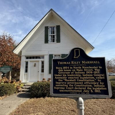 Thomas Marshall was born in North Manchester and became governor of Indiana and Vice President of the United States. His birth house, on north Market Street next to the library, was completely restored and furnished by the North Manchester Historical Society to its 1854 condition. It is open to the public on the first Saturday of the month from April to December from 1 PM to 4 PM. Free admission.